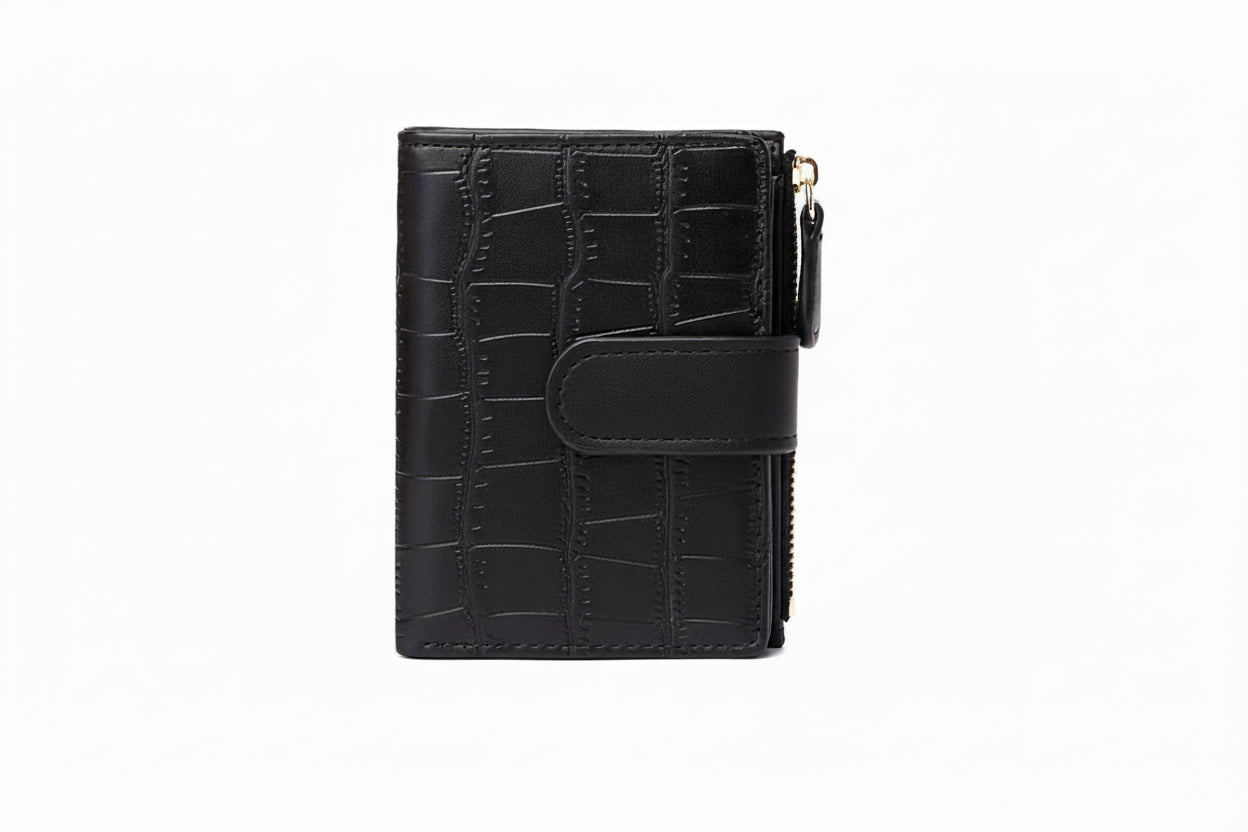 This versatile wallet combines fashion and function, offering ample storage for cards, cash, and coins in a sleek, minimalist design. The solid color and crocodile pattern create a timeless look that complements any handbag or can be carried on its own.
