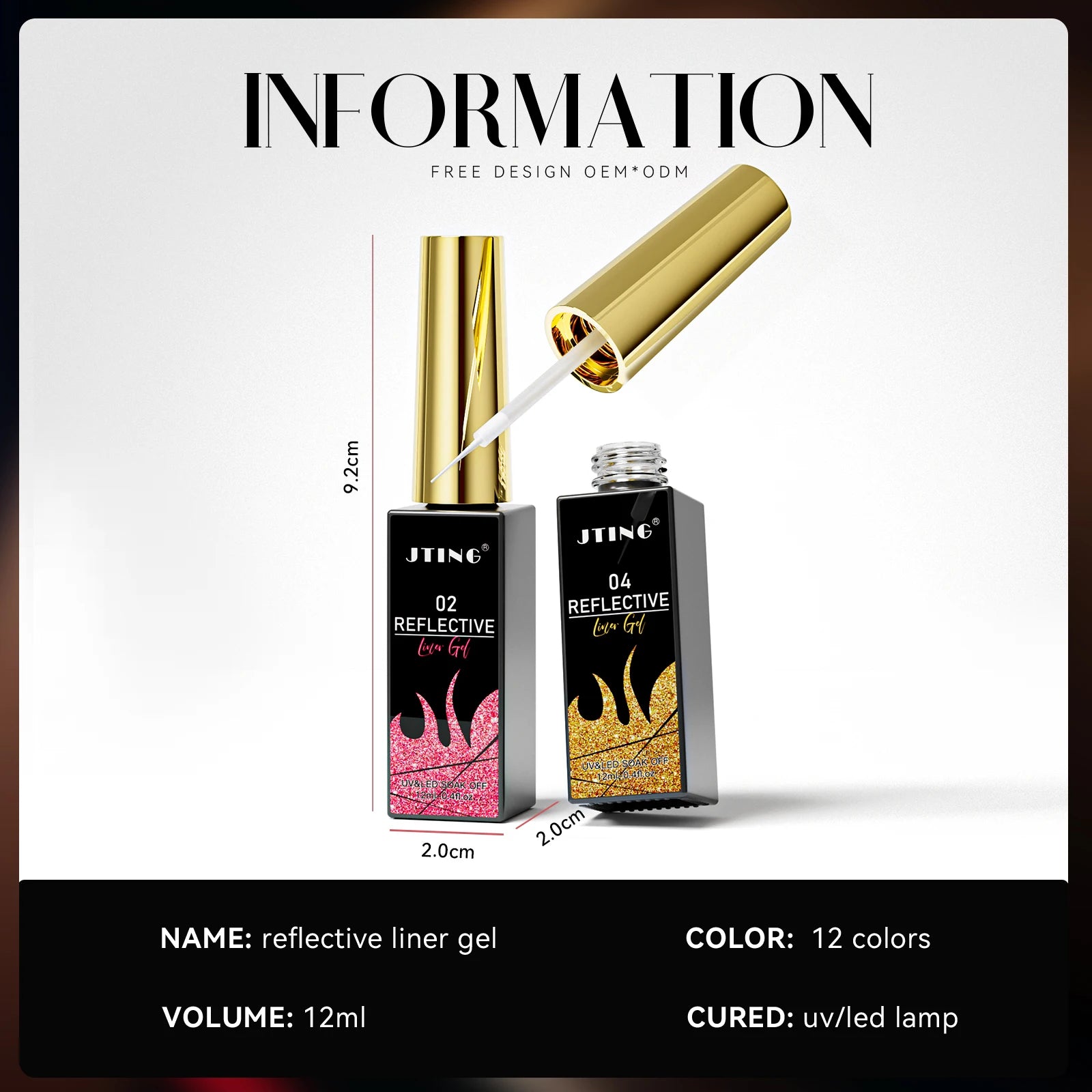 Create stunning, eye-catching nail art with this 12-piece super reflective disco liner gel polish set. Each shade features an ultra-reflective, high-shine finish perfect for detailed nail art designs, French tips, and creative line work.